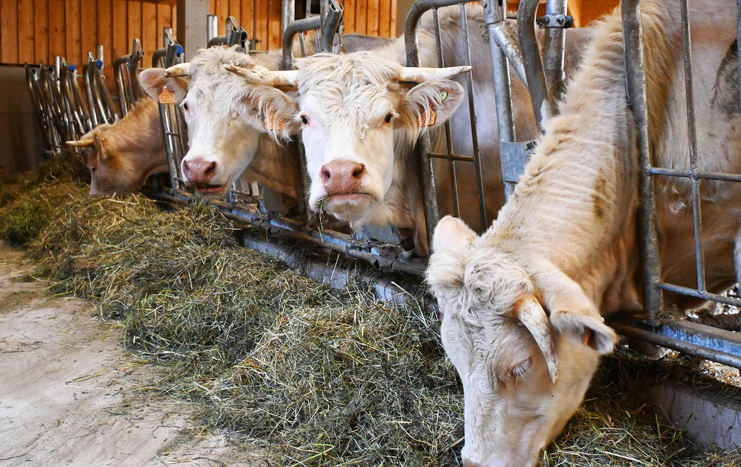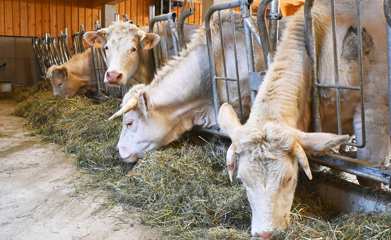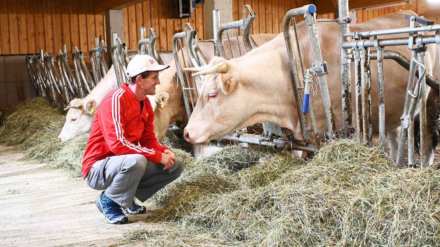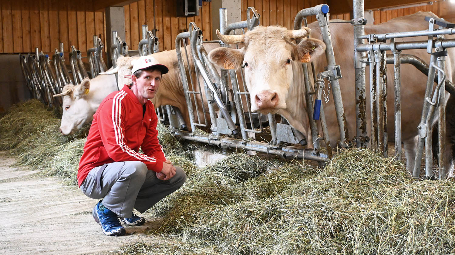 Dass die Charolais Rinder am Biohof Gstinig gut leben, sieht und spürt man auf den ersten Blick. Als Philipp den geräumigen Laufstall betritt, wird er mit der den Charolais eigenen Sanftmütigkeit begrüßt. „Charolais sind wunderbare Rinder“, sagt Philipp und erklärt: „Diese Rasse ist von Natur aus ausgeglichen, ruhig und stressresistent. Adrenalin, welches durch Stress freigesetzt wird, macht jedes Fleisch zum „zachen Brocken“, wie wir Osttiroler so sagen. Genau da setzen wir an: Unsere Jungrinder stammen ausschließlich aus der eigenen Zucht, leben im Herdenverband und werden völlig stressfrei geschlachtet.“