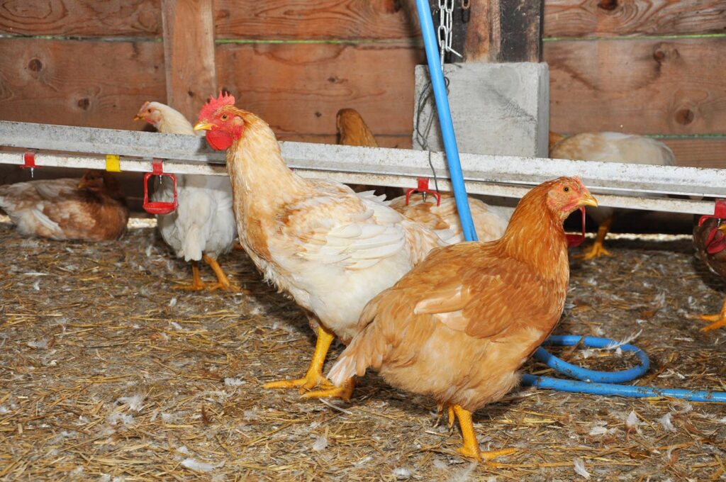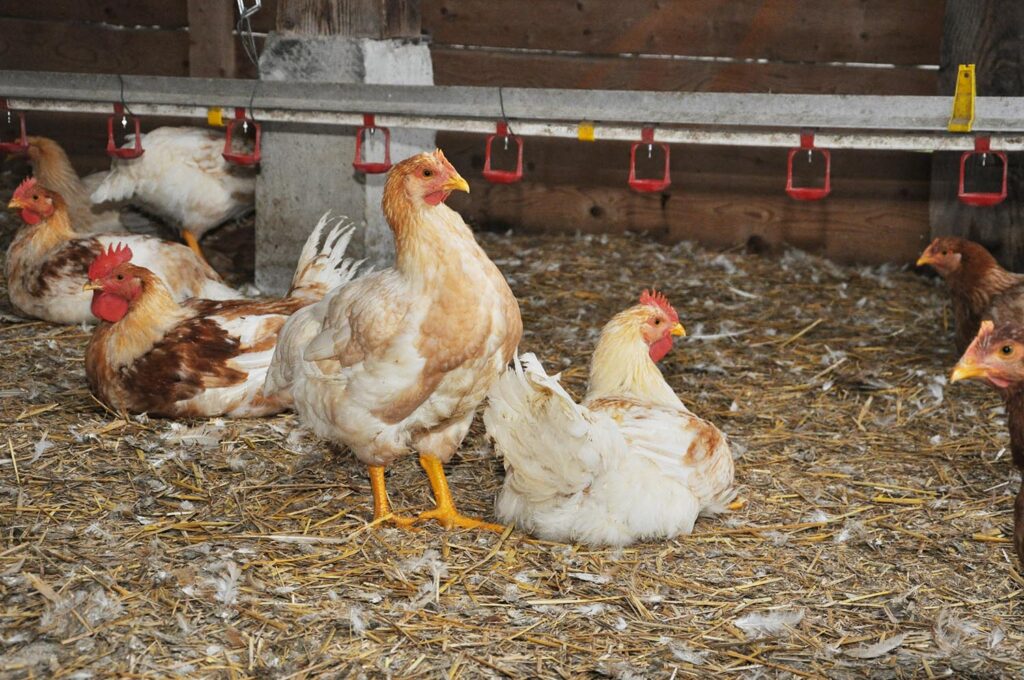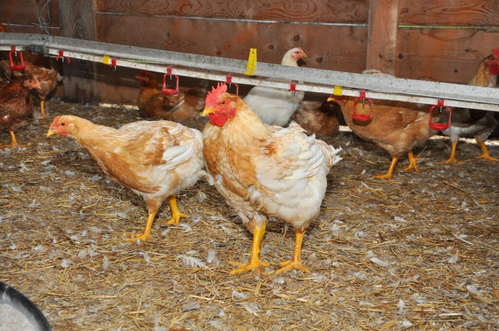 Die Haltung der Hendln sucht ihresgleichen: Rund 200 Hendln in einer Gruppe, ein echter Stall mit Stroh statt Industriehalle, rundherum gesäumt von grüner Wiese mit mehr als reichlich Auslauf. Auf das Thema Fütterung, Aufzucht und Schlachtung angesprochen, antwortet Michael Girstmair: „Ein Teil des Futters wird von uns am Hof produziert. Die Küken erhalten wir von einer Brüterei aus Oberösterreich, übrigens Hennen und Hähne. Geschlachtet wird völlig stressfrei direkt bei uns am Hof“.