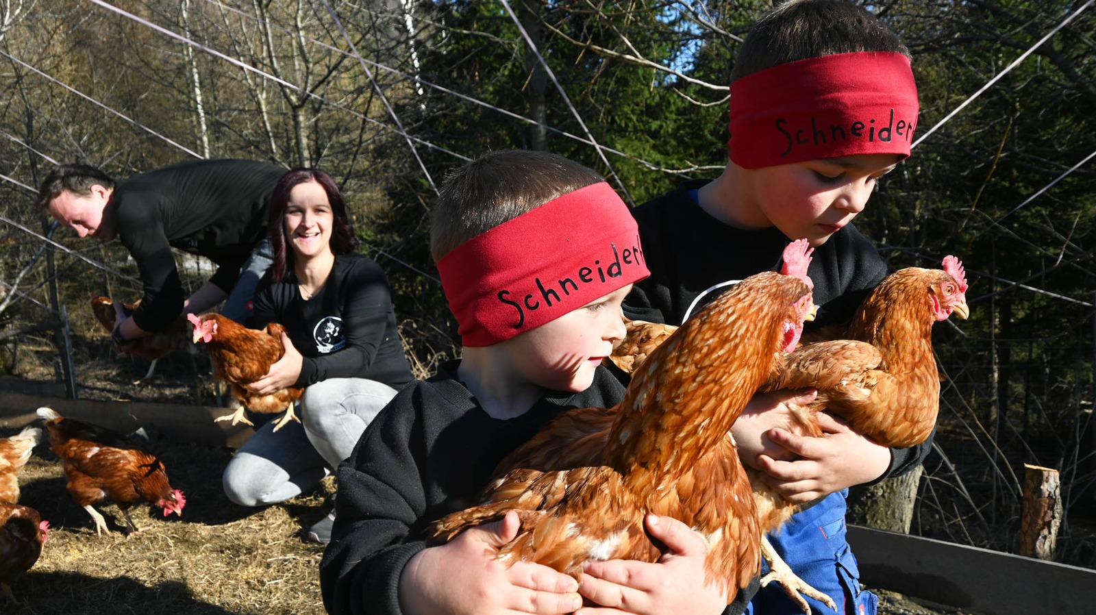 Neben den fröhlichen Ziegen lebt am Hof auch eine Hühnerschar. Dass das Federvieh in einem von Benjamin gebauten Stall lebt, der über jeglichen Komfort verfügt, versteht sich von selbst. Direkt vom Stall aus geht es für die Hühner in ein riesiges, geschütztes Freigehege. Diese danken es mit besten Eiern, die direkt ab Hof vermarktet werden.