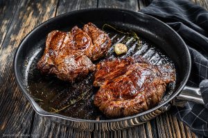 Möchtet ihr euch ein Steak zubereiten, so kann dies ganz einfach in der Pfanne angebraten werden. Denkt daran, das Fleisch mindestens eine Stunde vorher aus dem Kühlschrank zu nehmen. Das Steak scharf anbraten, anschließend in Folie wickeln und im Ofen nachziehen lassen. Die Temperatur sollte nicht mehr als 80°C betragen. Je nach Dicke des Steaks solltet ihr 15 – 30 Minuten einplanen. Ein gutes Rezept findet ihr auf Gusto.at unter diesem Link ..