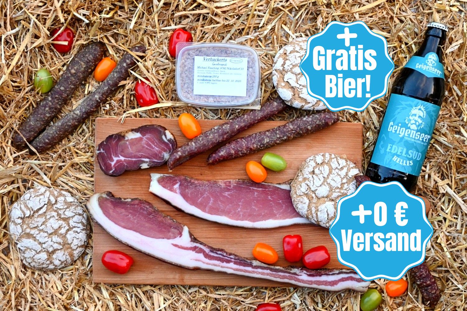 Gasslerspeck Brettl-Jause, ca. 10 Portionen, vom Osttiroler Strohschwein, plus gratis Bier und 0 € Versand